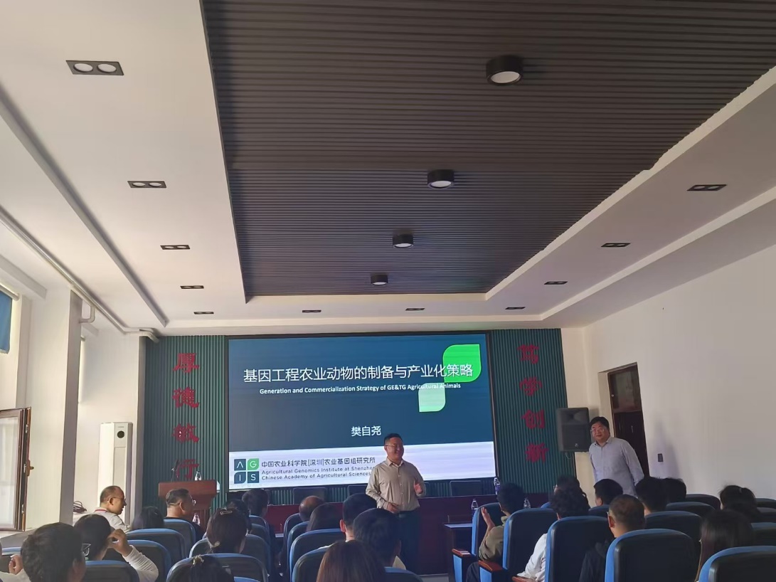 2024年9月26日,中国农业科学院(深圳)农业基因组研究所农业合成生物学中心樊自尧研究员应邀来到动物科技学院进行学术交流,为学院师生做题为“基因工程农业动物的制备与产业化策略”的学术报告。学院青年教师及全体研究生参加了此次活动,会议由科研院长王建发教授主持。