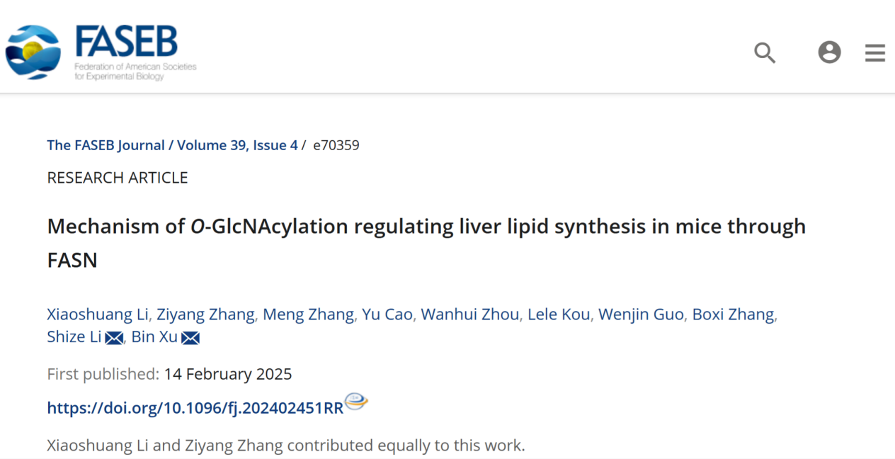 近日,我院畜禽应激分子调控机制创新团队师生在The FASEB Journal (中科院2区Top,IF=4.4)在线发表了题为“Mechanism of O-GlcNAcylation regulating liver lipid synthesis in mice through FASN”的研究论文,发现FASN O-GlcNAc糖基化修饰作为治疗的潜在靶点,为人类NAFLD的治疗/预防提供了新的见解。