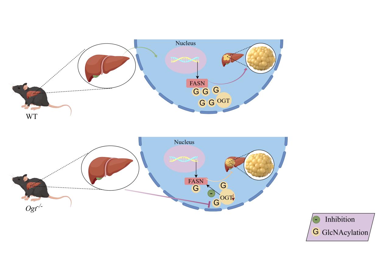 该研究团队以脂肪酸合成酶(FASN)和O-连接的N-乙酰葡糖胺(O-GlcNAc)修饰为切入点,通过干预OGT、O-GlcNAc糖基化修饰的底物发现O-GlcNAc糖基化修饰可以通过FASN调控肝脏脂质代谢的合成,从而减缓肝脏脂质积累,并且O-GlcNAc糖基化修饰可以抑制FASN K48位点介导的泛素化降解过程;体内特异性敲除肝脏Ogt基因后,其肝脏中脂质合成过程受到抑制,进而缓解肝脏的脂质积累。该研究为了解O-GlcNAc糖基化修饰通过FASN调控小鼠肝脏脂质代谢提供理论基础,也进一步为治疗非酒精性脂肪性肝病提供了潜在的靶点。