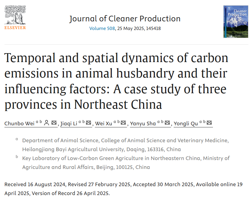 近日,我院寒区奶牛精准营养与生态安全技术研究团队在环境科学领域权威期刊《Journal of Clean Production》(中科院一区Top期刊,影响因子9.8)发表题为“Temporal and spatial dynamics of carbon emissions in animal husbandry and their influencing factors: A case study of three provinces in Northeast China”的研究论文,系统阐明了东北地区畜牧业碳排放时空动态特征及其影响因素。本研究由韦春波、李嘉琦、徐蔚、沙艳羽和曲永利等成员共同完成