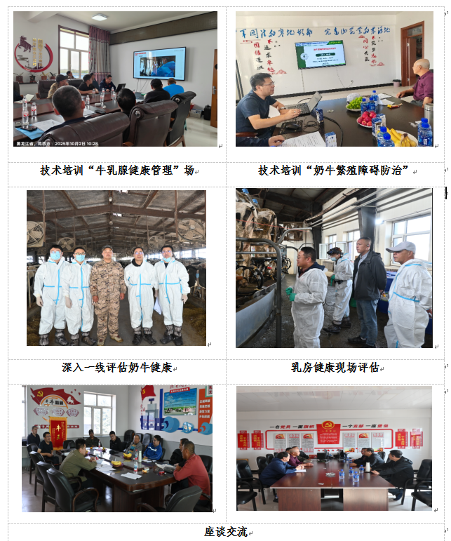 为深入贯彻落实党的“二十大”精神,助力北大荒农垦集团有限公司牡丹江分公司奶牛养殖业发展,发挥高校科研力量及全面落实好省“揭榜挂帅项目”2025年度奶牛普通病的任务内容,奶牛普通病团队于10月1日~5日对北大荒农垦集团有限公司牡丹江分公司开展了兽医技术展示、培训、专题讲座及技术问题咨询等工作。