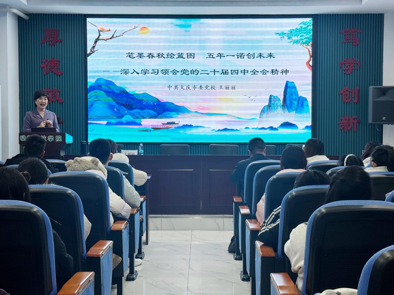 为深入学习贯彻党的二十届四中全会精神,切实将全会精神转化为推动学院高质量发展的的强大动力和务实举措,1125,学院邀请中共大庆市委党校王丽丽教授进行专题讲座。会议由学院党委书记王天亮主持,教职工及学生党员参加。