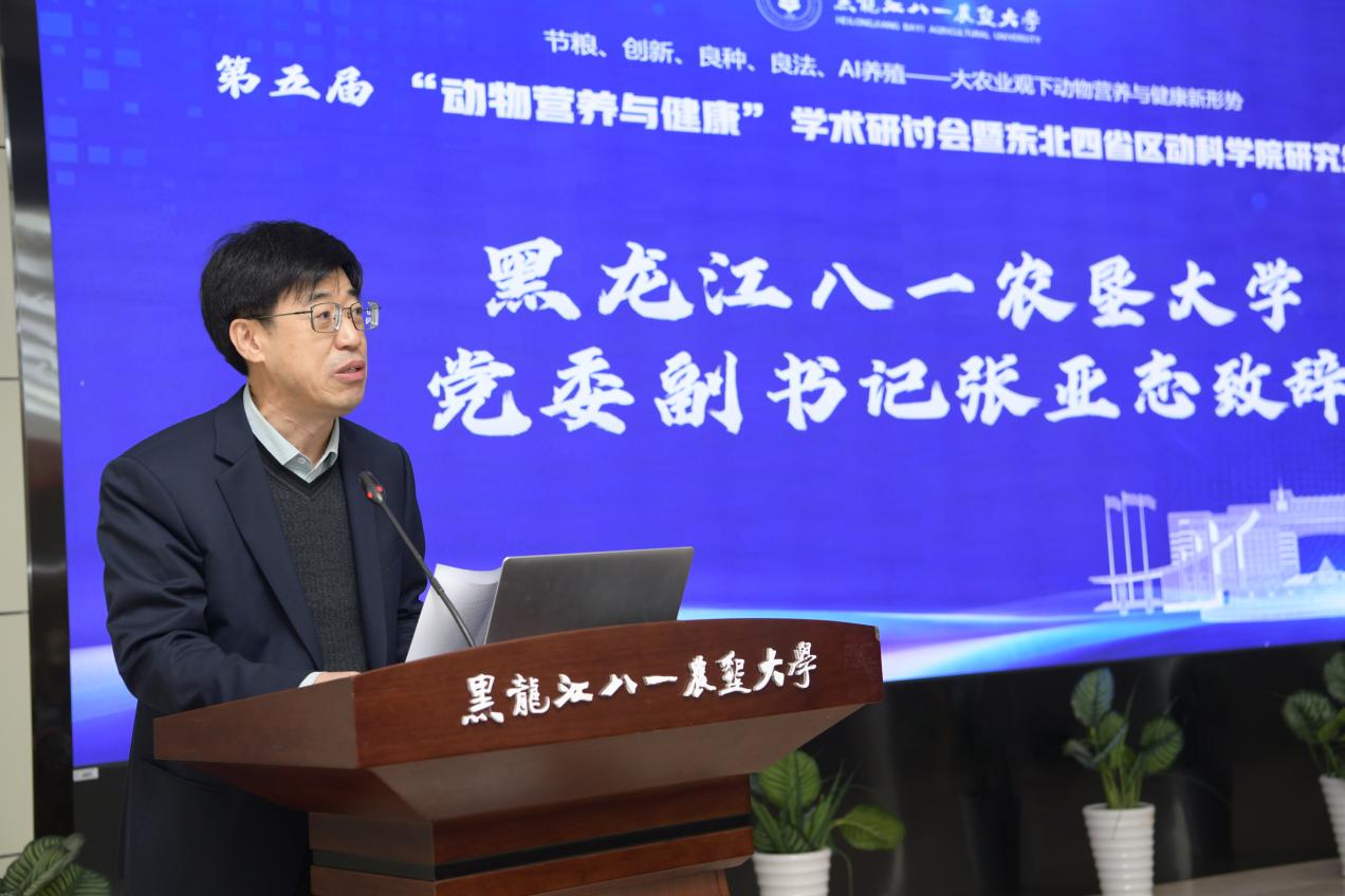 学校党委副书记张亚志代表学校向与会各位专家学者表示热烈欢迎,并向支持学校发展的兄弟院校和企业表示感谢。张亚志表示,动物营养与健康是畜牧业高质量发展的核心,关乎“大食物观”的践行与养殖业节粮增效目标的实现。本次学术会议是东北四省区动科学院积极响应党中央关于保障国家粮食安全、发展新质生产力战略部署的具体行动。他强调,八一农大始终秉持“立德树人、强农兴农”的使命,在动物营养、饲料科学、健康养殖、疾病防控等领域形成了自身的特色和优势。希望通过组织学术会议,聚焦学科前沿信息和畜牧生产中存在的热点问题,进行思想碰撞、智慧交流、成果分享,为推动东北四省区畜牧业科技进步和产业高质量发展作出更大的贡献。最后,他寄语广大研究生珍惜平台、勇于展示,将个人学术追求融入强国兴农的伟大事业,为推动东北地区畜牧业科技进步和产业健康发展贡献青春力量。