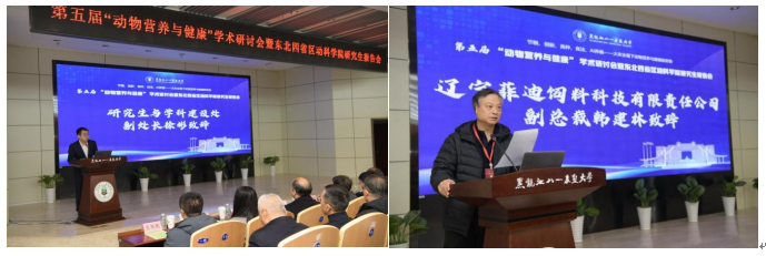 研究生与学科建设处副处长徐彬表示此次学术会议是东北四省区研究生交流的重要学术盛会,更是我校探索推进研究生教育、科技、人才一体化培养模式有机融合的重要载体。他希望广大研究生借此平台,拓宽学术视野,增强学术意识,将个人发展的坐标融入学校发展的经纬里。北京菲迪集团副总裁韩建林在致辞中表达了企业对产学研深度融合的坚定支持,以及对畜牧兽医领域青年才俊的殷切期望。他指出,菲迪集团始终重视与高校及科研机构的协同创新,通过共建研发平台、设立专项奖学金、校企联合培养模式等一系列务实举措,积极探索从基础研究到产业应用的有效转化路径,为行业可持续高质量发展注入源源不断的人才与技术动力。他鼓励与会学子珍惜此次学术交流机会,积极展示、深入研讨,将前沿理论与产业实际需求紧密结合,着力成长为驱动畜牧兽医事业发展的中坚力量。