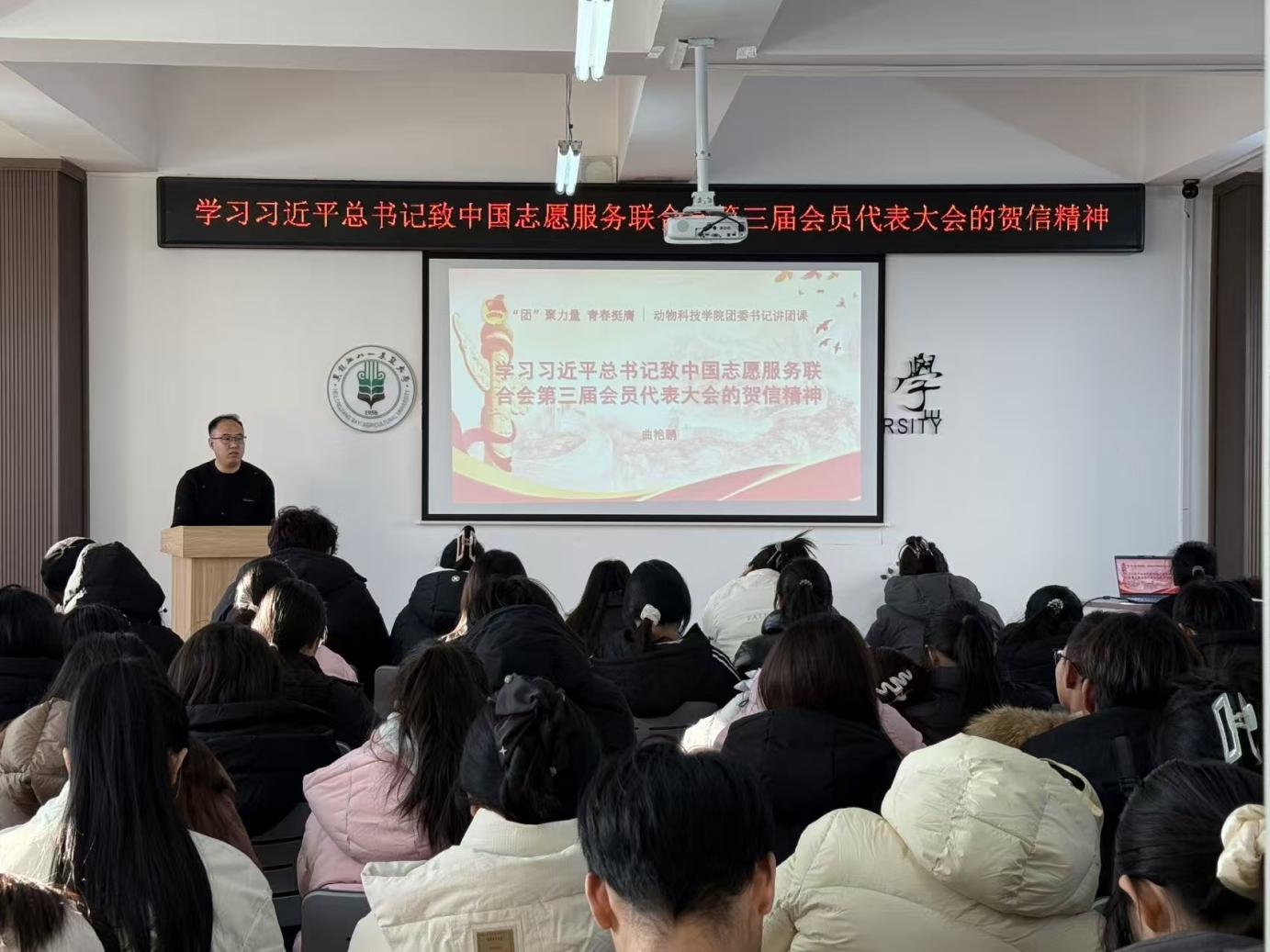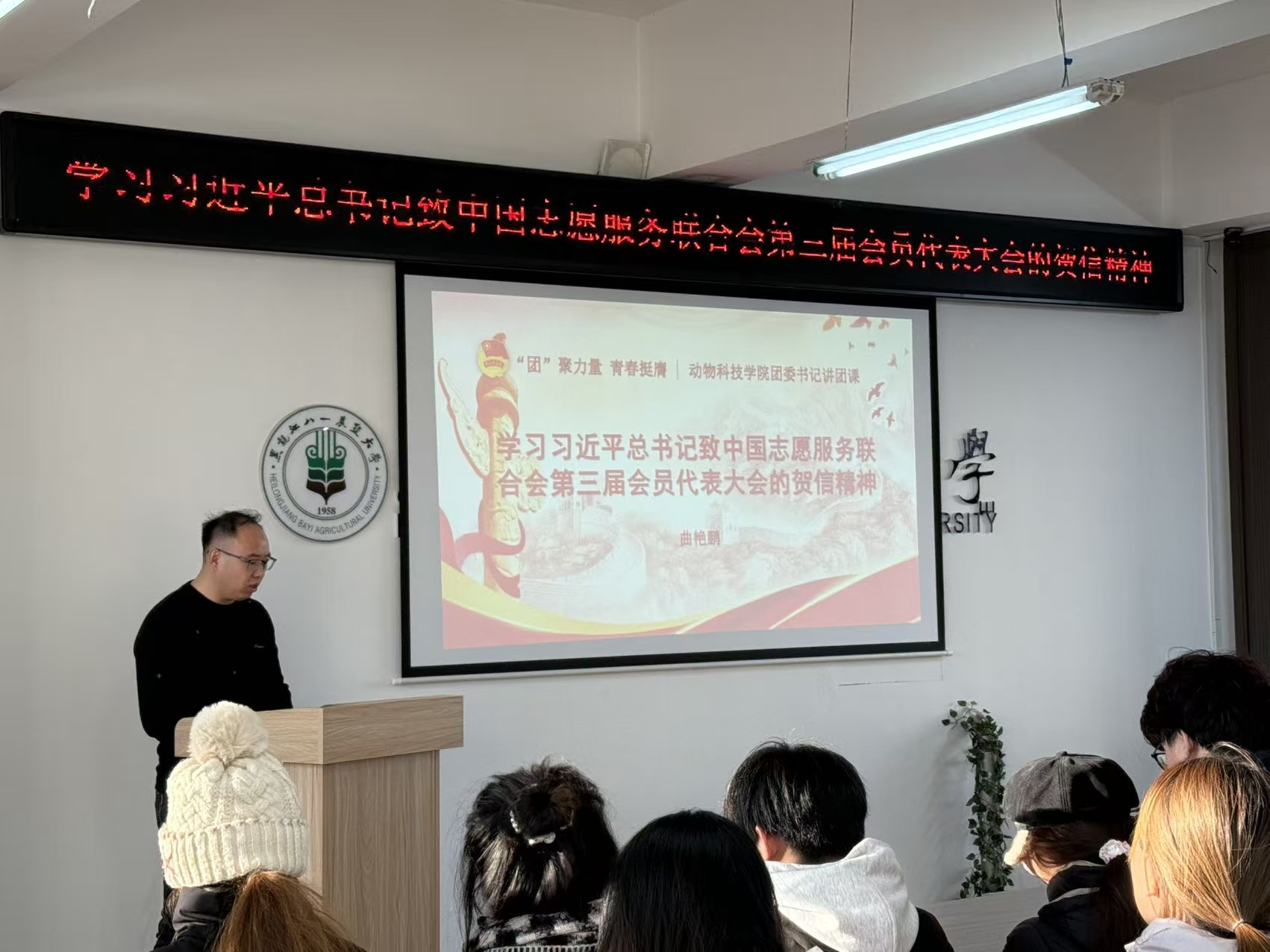 课上,曲艳鹏书记结合大会盛况与贺信原文,系统解读了习近平总书记贺信的核心要义和实践要求,详细阐述了志愿服务在中国式现代化建设中的重要地位、新时代志愿服务的发展方向,以及青年参与志愿服务的责任使命。通过分享西部计划、“童心管护”团队等生动案例,生动展现了广大志愿者将“小我”融入“大我”的奉献风采。
