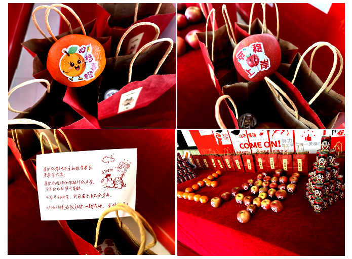 学院高度重视此次活动,精心策划并准备了承载满满心意的祝福锦“礼”包。礼包内不仅有饱含师生深情的祝福卡,更搭配了寓意美好的橙子、苹果与旺仔牛奶——苹果象征“苹”稳上岸,祝愿学子考场上沉着应变、稳定发挥;橙子寄托心想事“橙”的期许,盼学子旗开得胜、圆梦研途;旺仔牛奶则寓意好运连连。每一份礼品的寓意都经过字斟句酌,将学院的浓浓关切融入其中,为学子送去温暖与祝福。活动现场,整齐摆放的祝福锦“礼”包,成为冬日里最动人的风景。