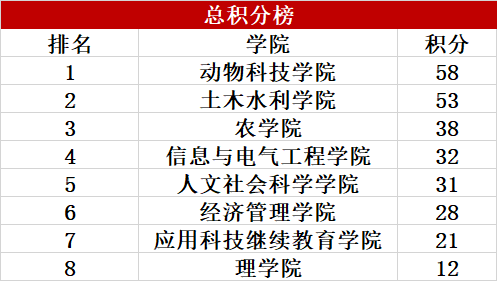 春日赛场燃激情,奋勇拼搏铸荣光。在我校第二届大学生身体素质挑战赛的激烈角逐中,动物科技学院学子凝心聚力、奋勇争先,凭借过硬的体能素养和默契的团队协作,以58分的团体总分荣登榜首,获得本次挑战赛团体第一名,用汗水与拼搏诠释了“实干显担当 健体强使命 阳光伴成长”的赛事理念,为学院赢得了荣誉。