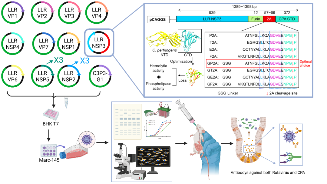 轮状病毒与产气荚膜梭菌是导致婴幼儿及犊牛严重腹泻的两大主要病原,常通过混合感染加重病情。然而,目前缺乏能够同时防控这两种病原体的联合疫苗。该研究通过优化GSG-P2A自切割肽,实现外源抗原的高效表达,并以人轮状病毒疫苗株LLR作为载体,构建表达产气荚膜梭菌α毒素C端结构域的重组轮状病毒。免疫母鼠后所产乳鼠在感染轮状病毒后未出现腹泻症状;致死剂量产气荚膜梭菌粗毒素攻毒后,免疫小鼠存活率达80%;免疫奶牛后,其血清和初乳中均检测到高水平的针对两种病原的中和抗体。该研究首次证实,以轮状病毒活疫苗为载体可稳定地递送细菌来源的关键保护性抗原,构建具有“细菌-病毒”双重防护能力的疫苗,为防控混合感染和开发多联多价肠道疫苗提供了新策略。